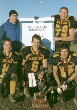 Daily Gleaner/ David Smith Photo) Among those shown here hoisting the Ed Skiffington Trophy and the NBIAA banner acknowledging provincial high school football champions are a group of Fredericton High School Black Kats including Bobby McIntyre, left, and Derek Madsen, right, following Saturday's emotional 26-9 win over Oromocto High School Blues in the league championship game. It was learned following the game that McIntyre had played with a broken fibula. He had two interceptions on the day and keyed what was a stingy Kats' defence |
