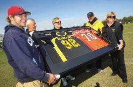 | Dan’s the man: Fredericton High School Black Kats football team paid tribute to former player Dan McCullough on Saturday at FHS field by retiring his number 92 jersey and encasing it in a frame alongside the number 70 he wears for the Canadian Football League’s B.C. Lions. On hand for the presentation were, from left, Dave McCullough, Dan’s brother; FHS athletic director Steve O’Rourke; FHS principal Ann Krause; FHS head coach Larry Wisniewski; and Joanne Levison, Dan McCullough’s mom. The OHS Blues went on to beat the Black Kats 16-7. |