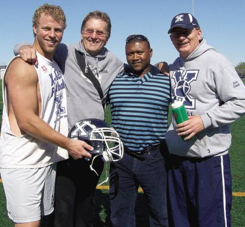 | Evolving into a football all-star: the evolution process for Fredericton's Dave Skillen, left, into an Atlantic University sport all-star with the St. Francis Xavier X-Men last season and a pro prospect with the CFL's Montreal Alouettes began when he played at Fredericton High School for three seasons getting the benefits from the coaching of, second from left to right, Larry Wisniewski, Lee Hoyt and Donny Davis, who is now an assistant coach at St. FX. Skillen, who plays defensive end, leaves June 1 for Montreal where he'll attend the Als camp. |