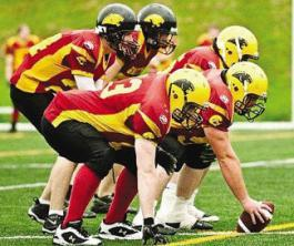 | Laying it on the line: Capital Area DQ Gladiators offensive lineman Andrew Gillingham, No. 63 in foreground, will be joining the Mount Allison Mounties football team in the fall. Tonight, though, he’ll be trying to help the Gladiators get past the Moncton Marshals in Maritime Football League playoff action at Chapman Field. |