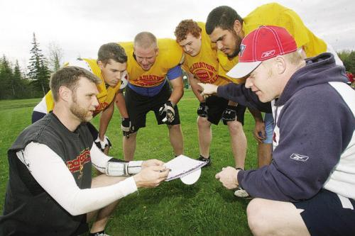 | Huddling up: Capital Area Gladiators’ coach and receiver Jeff Taylor, left, goes over some detail work with fellow coach and defensive end Jamie Edwards, right, under the watchful gaze of prospective players, from left: Andrew Hubbard, Erik Watson, Andrew Gillingham, and Jay Thomas during a team practice Wednesday night. The season-opening jamboree for the Maritime Senior Football League is in Moncton. |