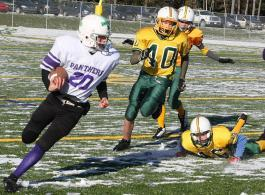 Published in the Daily Gleaner on Monday November 22, 2010 The Capital Area Minor Football Association teams came up short in Maritime football championship games Sunday before about 200 fans at Knowledge Park Drive Field. In the peewee final, the Bedford/Sackville Saints beat the Oromocto Panthers 30-6. The Dartmouth Destroyers also took the bantam championship back to Nova Scotia, downing the Fredericton Junior Black Kats 24-3. In the peewee game, Andre Boudreault opened the scoring for Sackville with a 40-yard punt return for a touchdown. Garret Jewers added the two-point convert. A tough defence by both teams resulted in the first quarter ending with the Saints still leading 8-0. In the second quarter, the Saints moved the ball well and Jewers caught a 15-yard pass in the corner of the end zone for a 14-0 lead. The point after by Jewers wasn't successful. Just before the half, Oromocto had a continuous drive leading to a 39-yard touchdown run by fullback Tyler Feltis to put the Panthers on the scoreboard. The half ended 14-6 Saints. In the third quarter, the Saints went back to work against a tough Panther defence. Aidan Majury scored on a two-yard plunge, followed by a Jewers convert. In the fourth quarter, William Chamberlain scored on a 10-yard reverse play and Jewers kicked the convert to close out the scoring. Most outstanding offensive players were Jewers and Feltis. Outstanding defensive player awards went to Tyler Robichaud for the Saints and Jake Riley for the Panthers. In the Maritime bantam final, the Junior Black Kats opened the scoring on their first possession with a 38-yard field goal by Quentin Crouse. The teams settled into a defensive struggle after that, with the Kats clinging to a 3-0 halftime lead. In the second half, the Destroyers used a strong ground game to grind out the time on a long drive that the Kats were able to stop, getting a turn over on downs. On the next Black Kat possession, defensive back Andrew Shaw intercepted a Fredericton pass and brought the ball back 15 yards to the Black Kat 32. This led to a late third-quarter touchdown when Destroyer halfback Tyler Gibson-Lorde caught a one-yard TD pass over the middle from quarterback Travis Stanfield. The convert by Liam Robinson was successful. In the fourth quarter, on the next series by the Destroyers, fullback Shaun Robinson carried the ball into the end zone on an eight-yard run up the middle. The convert upped the lead to 16-3 and the Destroyers weren't looking back. With time winding down, Stanfield connected with wide receiver Jake Moore in the corner of the end zone and Robinson's convert capped the scoring. Top offensive players were Robinson for Dartmouth and Blake Murphy for Fredericton. Defensive MVP awards went to Shaw for the Destroyers and Robert DeMerchant for the Black Kats. |