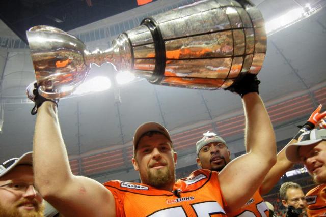 ![]() Fredericton's Dan McCullough holding the Grey Cup Dan began his football career with CAMFA in 1996. |