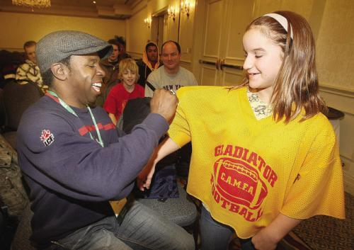 SIGN OF THE TIMES: Former Canadian Football League great Mike (Pinball) Clemons was in Fredericton on Thursday as the keynote speaker for the Canadian Home Builder’s Association of New Brunswick conference. He also spoke with a group of minor football league players. Above, he signs a jersey for Elizabeth Fagan, 12, of the Oromocto Grizzlies. Contagious enthusiasm