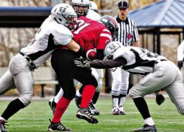 | UNB Fredericton Red Bombers Tommy Broad gets tackled by Moncton Raiders #5, left not listed in roster, and Joel Ricard, right, during the second half at Rocky Stone Memorial Field on Saturday during Atlantic League football action. |