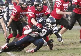 Seawolves snare first place with soggy win over Bombers Football: UNBSJ improves to 3-0 with victory in its first-ever home game By Jon MacNeill Published in the Telegraph-Journal on Monday October 26, 2009 Appeared on Page B5 SAINT JOHN - The University of New Brunswick Saint John Seawolves secured a spot in the Atlantic Football League final after dropping the University of New Brunswick Fredericton Red Bombers 10-6 Sunday night. The win improved the Seawolves club team to 3-0 in their inaugural home game and guaranteed them a slot in the championship game slated for Nov. 21 in Saint John. Saint John got on the board early in the second quarter when John Phillips sent the pigskin through the uprights for a 15-yard field goal. Running back Justin Cavan made a leaping reception for a substantial gain and Charlie Harroun made a 35-yard run to put the Seawolves within striking distance. The Bombers replied just a few minutes later after tight end Andrew Guest made a 20-yard pass-and-run play to give them field position at their 50 yard line. Star receiver Andrew Hubbard completed the drive in the next play, reeling in a pass from quarterback Brendan Cornford and breaking loose from two Seawolves defenders for a 50-yard touchdown run. The point after attempt failed but the Bombers found themselves threatening to score once again after recovering a Saint John fumble. As the Bombers pressed to increase their lead, the cheering section began its own spirited battle with the estimated crowd of 700 people at Shamrock Park divided into two camps chanting for their squad. The Bombers were unable to complete the drive and the first half ended with a 6-3 Fredericton advantage. "We couldn't finish anything off offensively; there were a lot of plays available to us and we dropped the ball a couple of times and just broke down," Red Bombers head coach Mike Dollimore said after the game. To make matters worse, Hubbard left the field at halftime with a pulled hamstring and didn't return for the final session. "He's an impact player, no question. And when Andrew goes down it limits our offence significantly," said Dollimore, who expects Hubbard will return to action for the Bombers final regular season game against Moncton on Friday. An already soggy field was reduced to the equivalent of a grease pit by the second half as both teams struggled to get the ball downfield. Heavy rain in the Port City Saturday night left Shamrock Park in rough condition for Sunday's tilt. "It was tough sledding out there, but we just tried to gain positive yardage however we could," Seawolves head coach Dave Grandy said. Harroun was a major player in that respect, driving hard and giving his squad solid field position on several carries throughout the game. The Seawolves offence also struggled to finish their drives, however. "We could have minimized our mistakes and we were putting ourselves in bad situations (as a result of penalties). But at this point, I'll take the win any way we can get it," Grandy said. The winning touchdown came from a thrilling 45-yard pass-and-run play executed by Cavan, who snagged the pigskin and shook off two red sweaters while driving it to the house. Phillips kicked the extra point for a 10-6 lead mid-way through the fourth quarter. Fredericton had an opportunity to land a major in the closing minutes of the game, taking advantage of a couple Saint John penalties and setting up near the Seawolves 20-yard line. "You need to play smart football and we played some undisciplined ball there (in the closing minutes) and it could have cost us," Grandy said. The Seawolves defensive-line stood tall, though, shutting the Bombers down and regaining possession as the clock ran out. En route to the loss, the Bombers missed three field goal attempts. "Execution just really wasn't there today. We couldn't pull it together, but next time we meet them, hopefully in the final, we'll take them down," Cornford said. Now 1-2, Fredericton will battle Moncton (0-2) for second place and home-field advantage in the league semifinal slated for Nov. 14. |