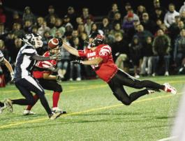 | Stretching it out: David Carr, right, of the Fredericton-UNB Red Bombers stretches out to the max in pursuit of the ball during Saturday's inaugural game in the newly formed Atlantic Football League at Chapman Field. Tim Jackson (in black) of UNBSJ Seawolves is poised to make the catch but Carr's effort prevents that. The Seawolves won the game 16-14 on a last minute field goal by John Phillips from 29 yards out. The game marked the return of football to the UNB campus for the first time in 30 years. |