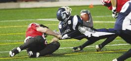 | Fredericton-UNB Red Bombers Dylan Sullivan, left, grabs the uniform top to haul down UNBSJ Seawolves' Tim Jackson during Saturday's inaugural game in the Atlantic Football League at Chapman Field. Sullivan was flagged 10-yards for this tackle. Some 2,300 fans make their way to Chapman Field to witness the first Red Bombers' game at UNB since the program was scrapped by the school 30 years ago. Bombers' head coach Mike Dollimore termed the evening 'electrifying.' |