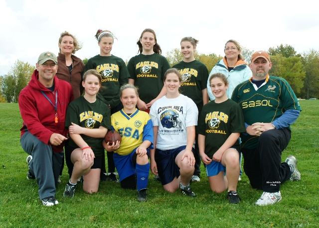 of football. Each player wears a "flag" on each hip. Players are tackled by having a flag pulled off. A maximum of